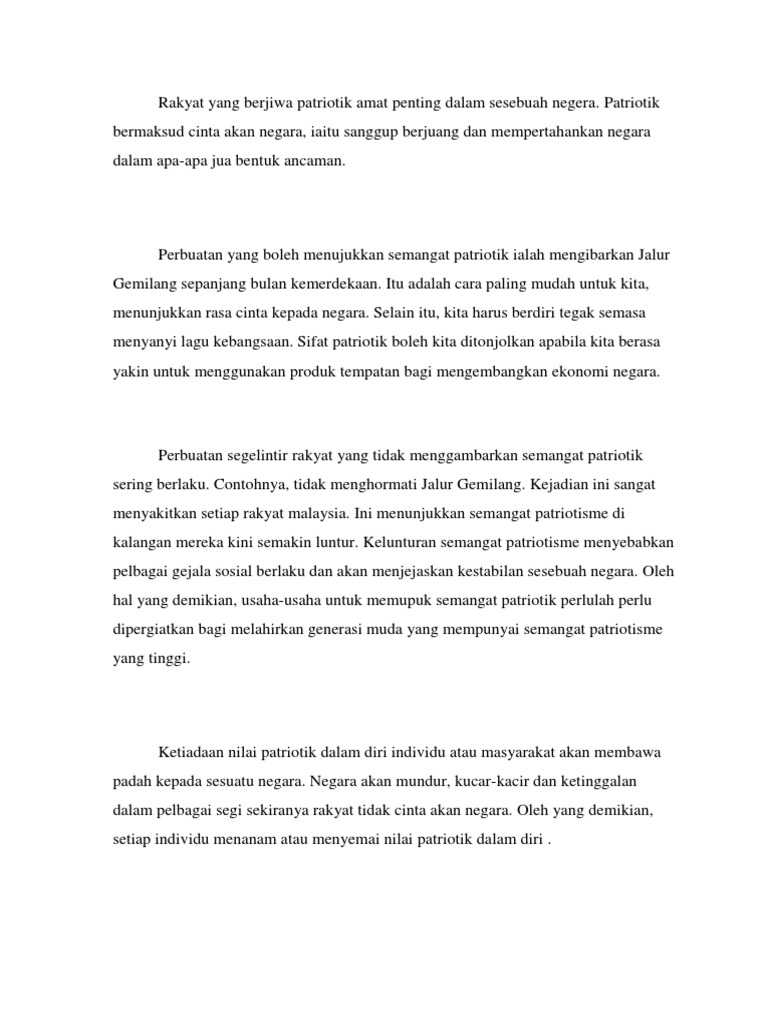 Pada marcapada yang pesat membangun dalam teknologi maklumat ini semangat patriotik adalah penting untuk membina jati yang kental dan kuat agar dapat mewujudkan perpaduan nasional. Karangan Cara Cara Menunjukkan Rasa Cinta Akan Negara Spm. Satu daripada caranya adalah dengan memberikan penekanan tentang proses pemupukan.